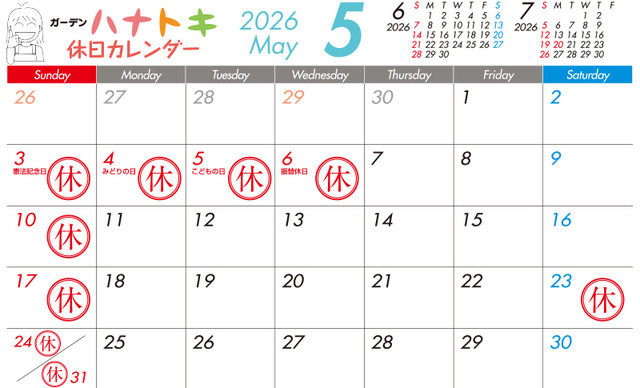 2026.04.18 5月休日カレンダー 定休日: 3(日)・4(月)・5(火)・6(水)・10(日)・17(日)・23(土)・24(日)・31(日) Post Share LINE ★ハナ得情報★WEB広告 前の記事
